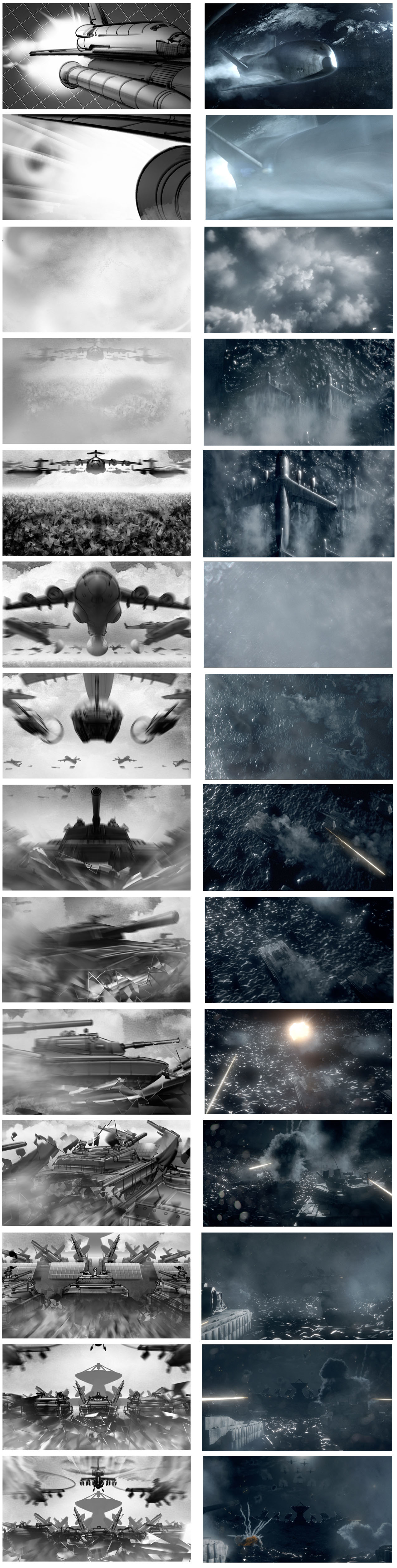On the left are my original boards, and on the right are the screenshots from the final movie. ย They diverge a bit in the middle- there was a lot of concern from the producers about the production schedule and while we had to make sure this movie carried a lot of visual impact, we had to be realistic about the time it would take to produce it, and so we streamlined some of the visuals in order to ensure the delivery date. ย Still, I was really proud of my boards on this one.